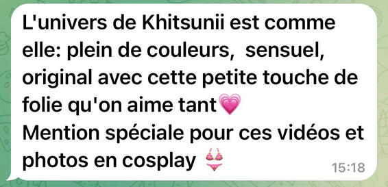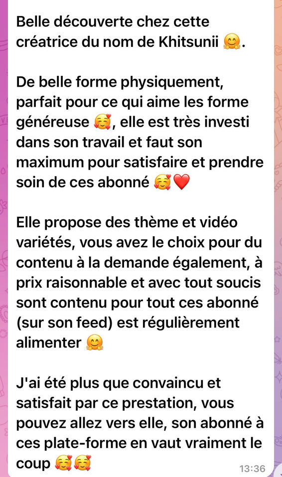 Belle découverte chez cette créatrice du nom de Khitsunii 🤗.De belle forme physiquement, parfait pour ce qui aime les forme généreuse 🥰, elle est très investi dans son travail et fait son maximum pour satisfaire et prendre soin de ces abonné 🥰❤️Elle propose des thème et vidéo variétés, vous avez le choix pour du contenu à la demande également, à prix raisonnable et avec tout soucis sont contenu pour tout ces abonné (sur son feed) est régulièrement alimenter 🤗J'ai été plus que convaincu et satisfait par ces prestations, vous pouvez allez vers elle, s'abonner à ces plate-forme en vaut vraiment le coup 🥰🥰(Voir le message original 👇)