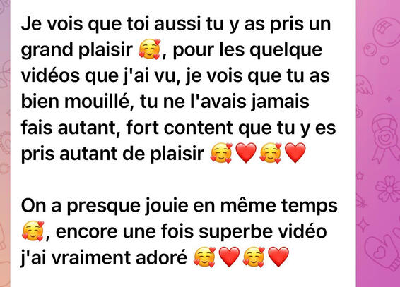 Je vois que toi aussi tu y as pris un grand plaisir 🥰💞, pour les quelque vidéos que j'ai vu, je vois que tu as bien mouillé, tu ne l'avais jamais fais autant, fort content que tu y es pris autant de plaisir 🥰❤️On a presque jouie en même temps 🥰, encore une fois superbe vidéo j'ai vraiment adoré 🥰❤️(Voir le message original 👇)