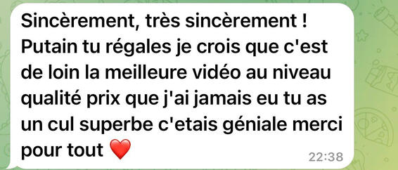 Sincèrement, très sincèrement ! Putain tu régales je crois que c'est de loin la meilleure vidéo au niveau qualité/prix que j'ai jamais eu. Tu as un cul superbe, c'était génial, merci pour tout ❤️(Voir le message original 👇)