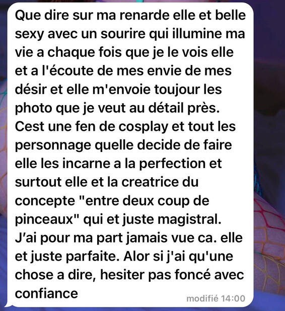 Que dire sur ma renarde, elle est belle et sexy avec un sourire qui illumine ma vie à chaque fois que je le vois. Elle est à l'écoute de mes envies, de mes désirs, et elle m'envoie toujours les photos que je veux au détail près.C'est une fan de cosplay et tous les personnages qu’elle décide de faire, elle les incarne à la perfection. Et surtout, elle est la créatrice du concept "entre deux coups de pinceaux", qui est juste magistral.